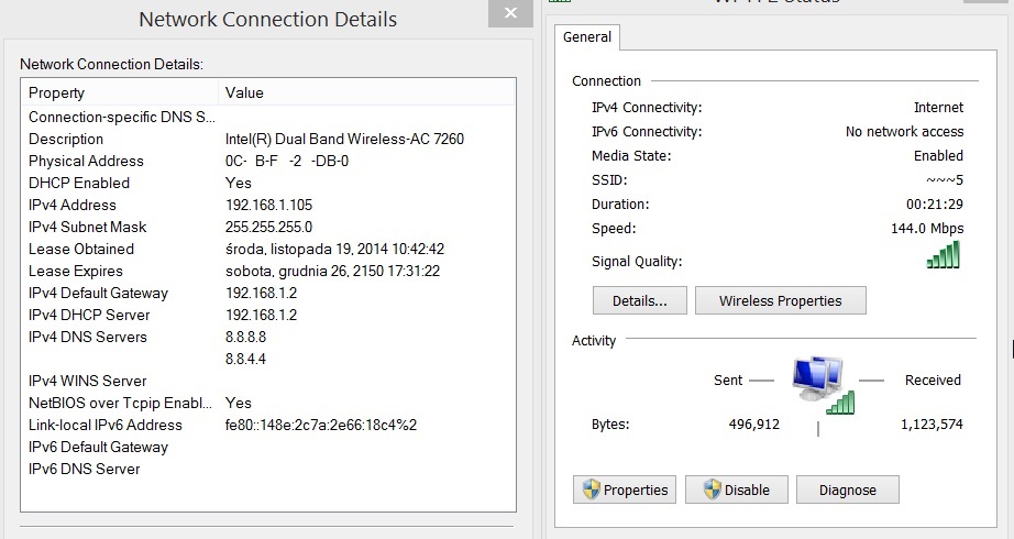 Po stronie pc posiadam karte intel ac7260, wiec oba urządzenia powinny współpracować w standardzie 'ac' niestety max prędkość jaką pokazuje karta pc na pasmie 5GHz to 176Mbps(najczęściej 144Mbps) a gdzie tu mowa o 1750Mbps :). Jeżeli zaloguję się na pasmo 2.4GHz karta pokazuje max prędkość 300Mbps i mimo ponad 30 hot spotów na tym pasmie w miarę dobrze to śmiga, mimo "przepełnienia". Próbowałem zmieniać również ustawienia karty sieciowej wg instrukcji na stronie intela i na 5GHz wciąż to samo (rozłącza i wolno), wiec obstawiam na router.