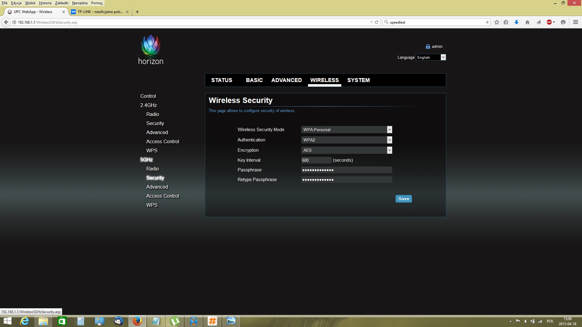 Jak wygląda konfiguracja radia na routerze? Z inSSIDer-a link wygląda słabo bo tylko 54Mb/s.