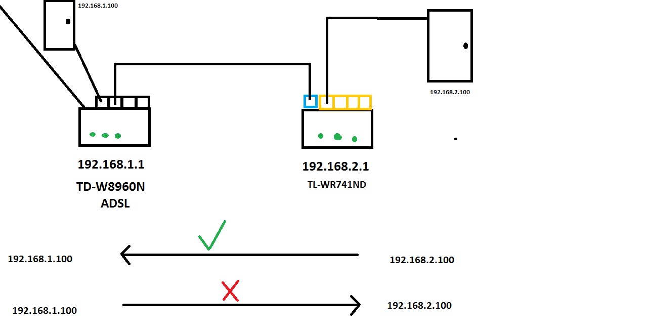 Problem polega na tym że nie ma widoczności między 192.168.1.100 a 192.168.2.100