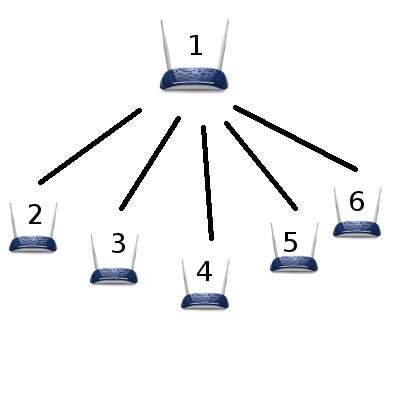 Router 1 będzie łączyć się z pozostałymi, ale routery od 2 do 6 ze sobą nie muszą się łączyć.