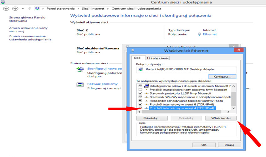 Zaznaczamy interesujący nasz protokół - w większości będzie to IPv4 oraz klikamy właściwości