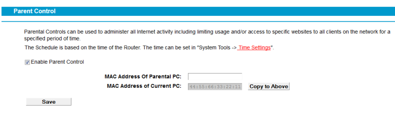 A w zakładce MAC Address Of Parental PC: wpisujemy lub kopiujemy (Copy do Above) adres mac naszego komputera (komputer administratora/rodzica) i klikamy SAVE.
