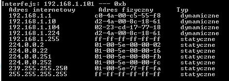 To zrób ping 192.168.1.255 do adresu broadcast-owego (on nie będzie odpowiadał i nie pokazuj go) a potem jeszcze raz arp -a i pokaż jeszcze raz obrazek.