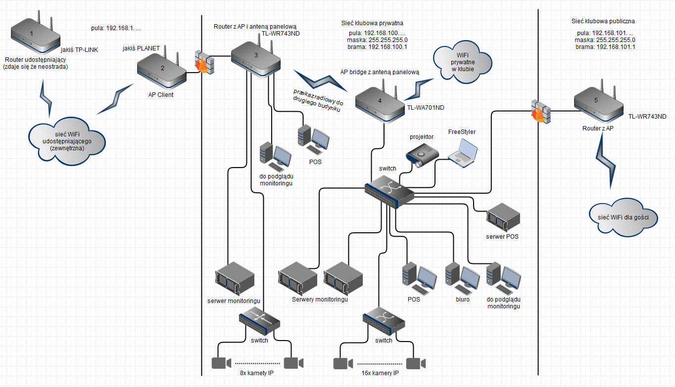 Przed rozbudową to tylko do AP Client [2] był podłączony jeden komputer i śmigało bez problemu ale w momencie modernizacji naszego klubu muzycznego postanowiliśmy rozbudować i sieć komputerową wewnętrzną i dać możliwość dostępu do internetu naszym klientom.