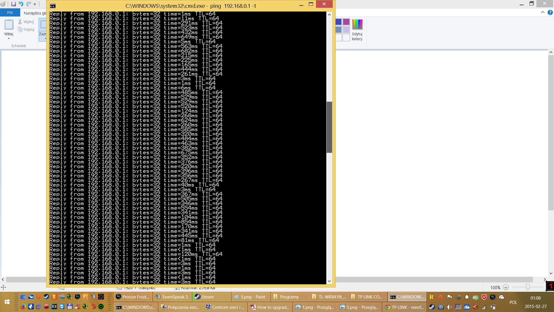 W momencie gdy występują problemy z internetem to w trakcie testu we wszystkich oknach konsoli skacze ping, zarowno na DNS, wp.pl i na routerze.