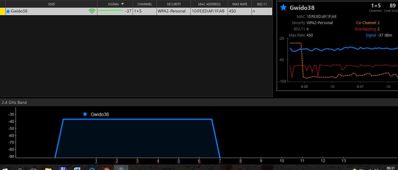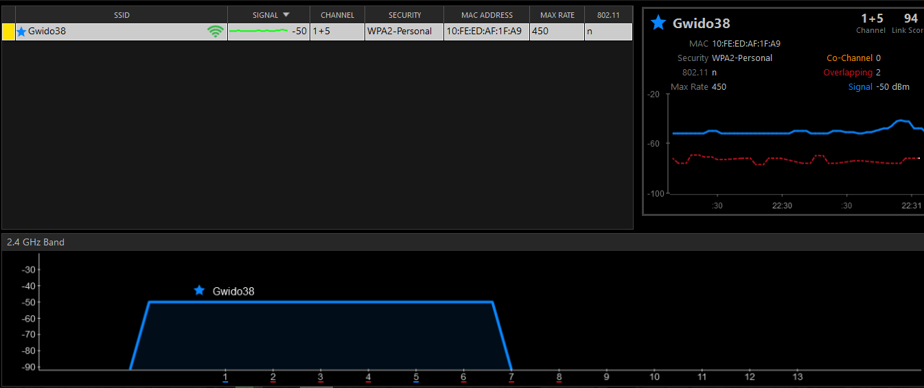 Sprawdziłem siłę i jakość sygnału przy pomocy InSSIDera oraz prędkość kopiowania z dysku w komputerze na dysk sieciowy NAS po łączu WiFi do routera TP-Link WR1043ND v2 z wgranym Gargoylem i z niego po LAN 1GB kablem ekranowanym.