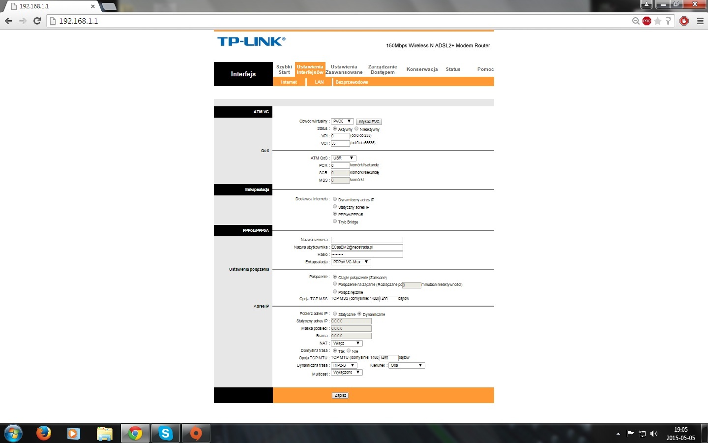 Początkowo miał ustawiony PPPOA/VcMUX, potem wydlug zalecen linii techniczej Orange PPPOE/LLC ale problem nadal występował.