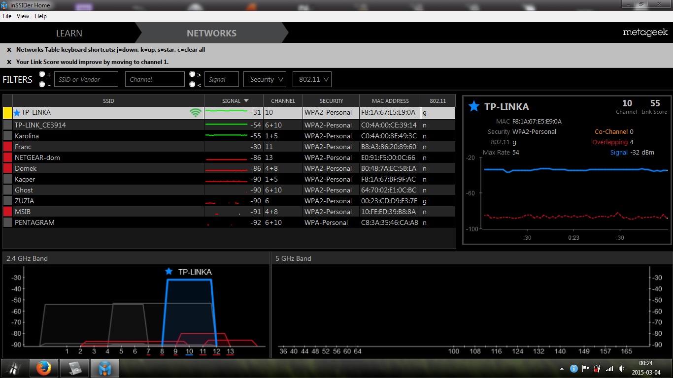 Ustaw szerokość kanału na 20MHz oraz dla testów ustaw tryb 11bg( bez N-ki). Dla zobrazowania wrzuć również skanowanie sieci z programu Inssider.