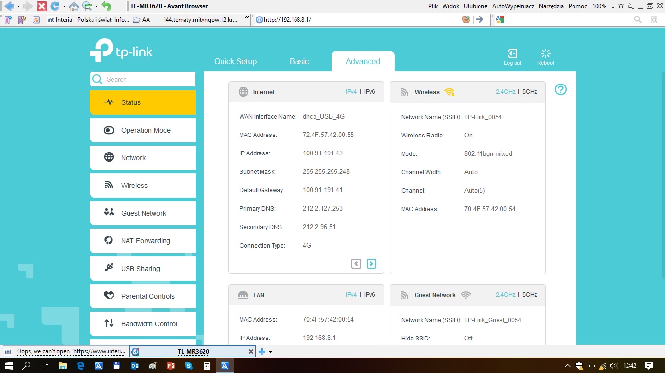 Chciałem prosić o pomoc.Niestety ale nie moge ustawić modemu w roterze MR 3620 .Modem to Huawei E3372s .Podłączyłem do routera.Nie zmieniałem nic w ustawieniach bo widziałem że wszystko automatycznie sie ustawiło.Ale niestety nie łączy nic.Modem miga ale niema internetu