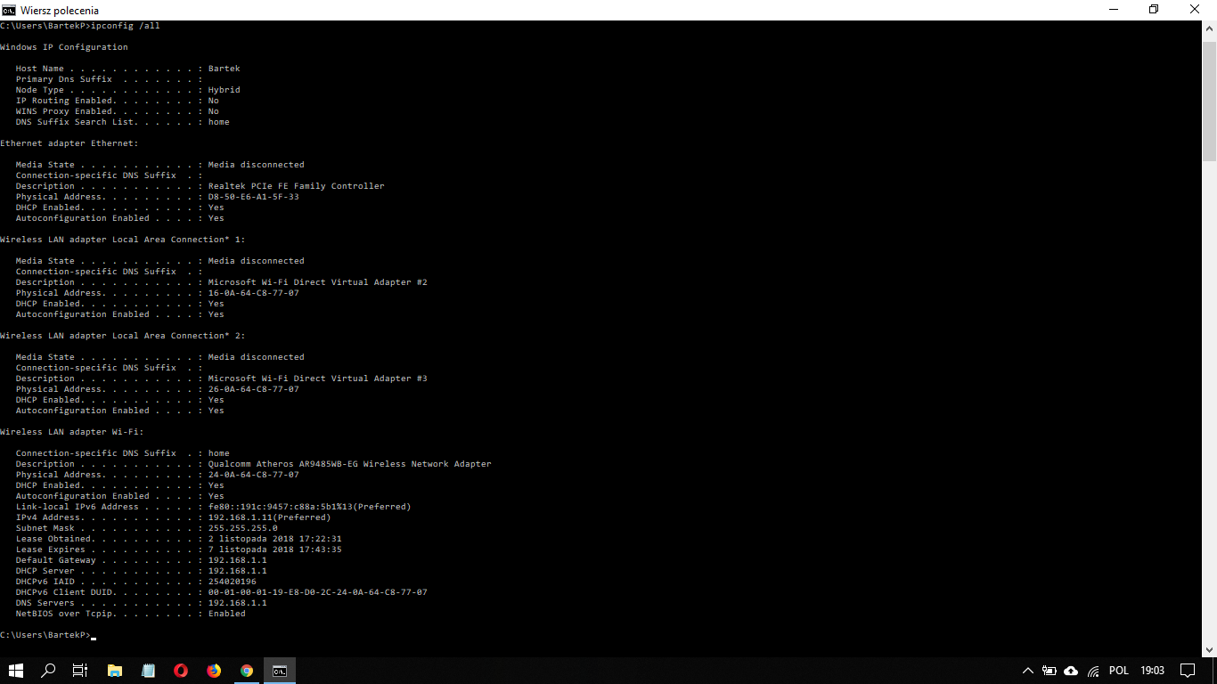Podłącz się pod TP-Linka i pokaż wynik polecenia IPCONFIG /ALL