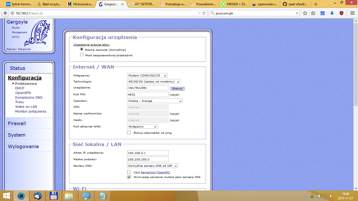 Mam wdr3600 z najnnowszym gargulcem z eko.one.pl. Modem to E3372 bez HiLinka. Konfigurowałem zgodnie z poradnikiem, ale nie łączy sie z Internetem. W zakładce status mam tylko siłę sygnału -81, ip nie dostaje. Wygooglałem, ze muszę wydać komendę