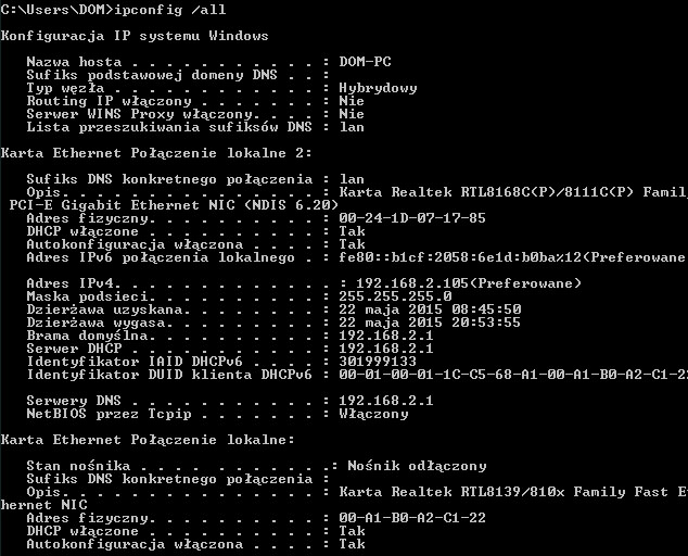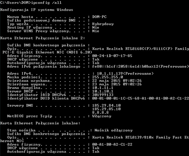 Poniżej zamieszczam kilka zdjęc z konsoli (przy wpiętym routerze i samym kablu) i karty sieciowej: *** WPIĘTY KABEL: