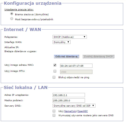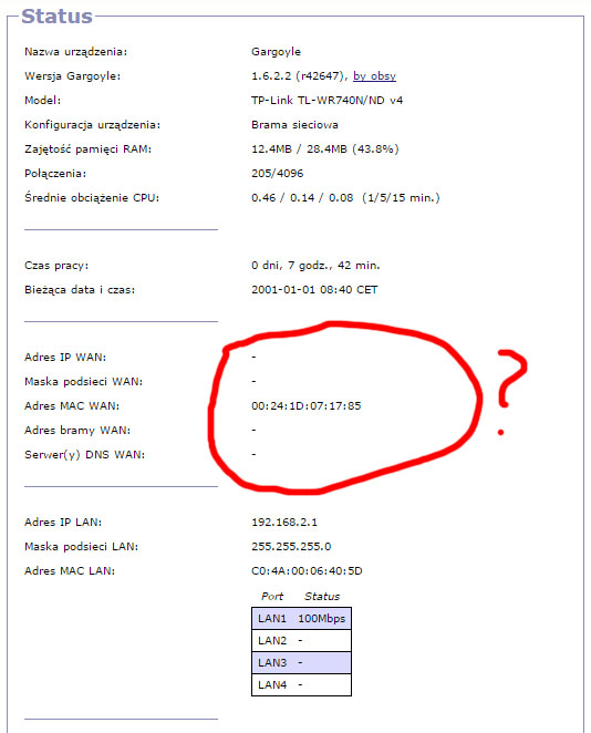 Próbowałem już na wszystkie sposoby: klonowałem mac, zmieniałem ip w lan (192.168.0.1->192.168.4.1), sprawdzałem czy port WAN jest sprawny, zmniejszałem MTU, wyłączyłem wszystkie wartości "Auto", ustawiałem DNS'y niestety bez skutu - ciągle to samo.